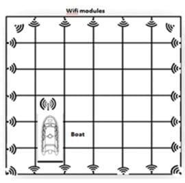 A wireless transceiver placed on the boat receives varying signal strength from the grid sensor.